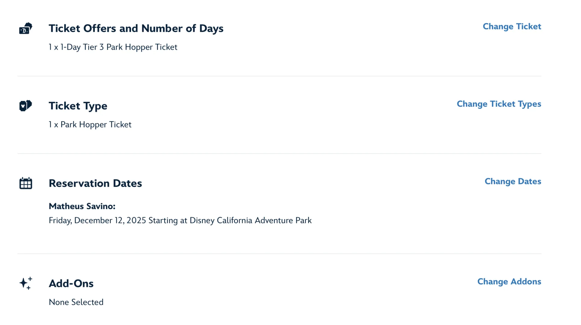 Você pode modificar a data de reserva, incluir mais dias, mudar o tipo de ingresso, ou até mesmo adicionar um extra como Lightning Lane Multi Pass na sua seleção, diretamente pelo site da Disney, como explico no passo a passo abaixo: