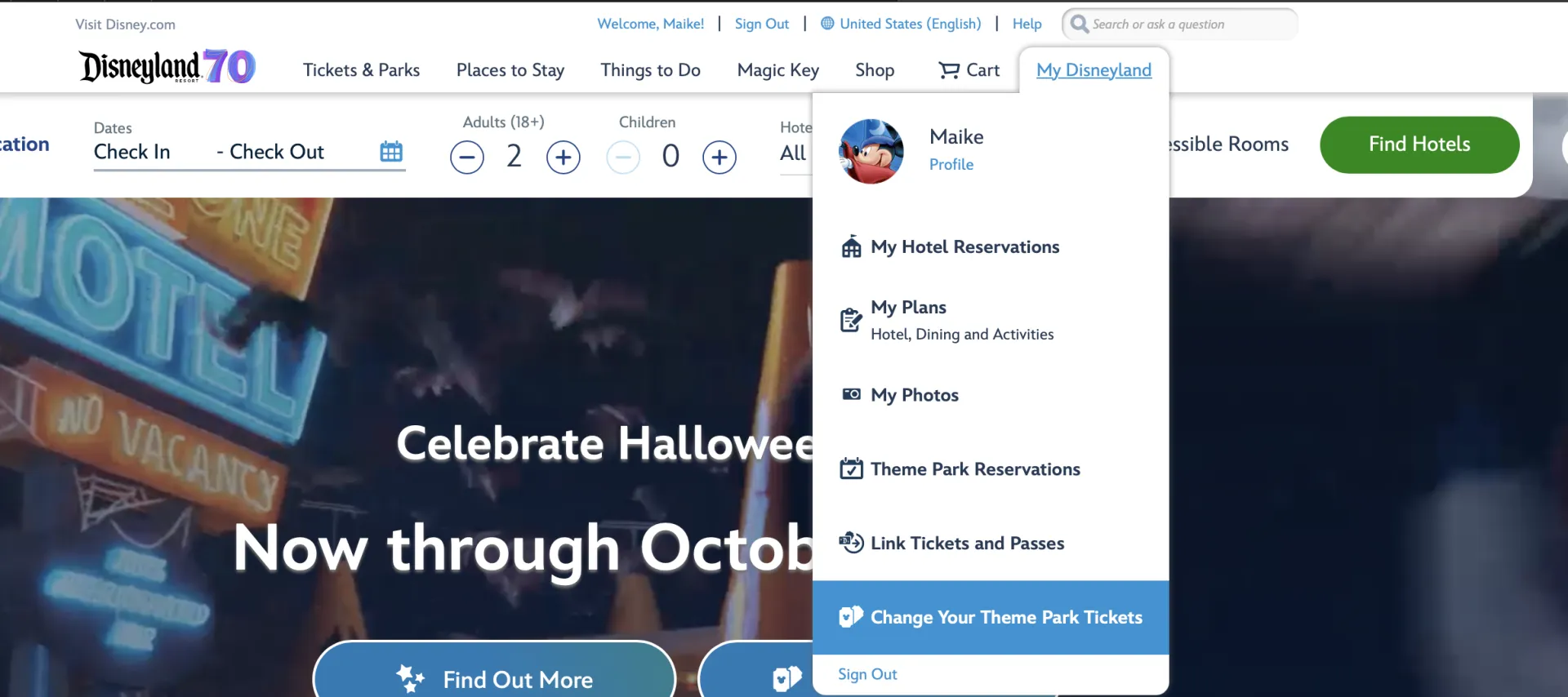 3- Quando a página carregar, será possível preencher os campos de Login e Senha, e caso esteja navegando pelo site em Português, mude para a versão em Inglês (United States (English)) no topo da página. Acesse a opção “My Disneyland” logo abaixo do campo de busca, e para acessar o ambiente de alterações dos seus ingressos vinculados, selecione “Change Your Theme Park Tickets”: