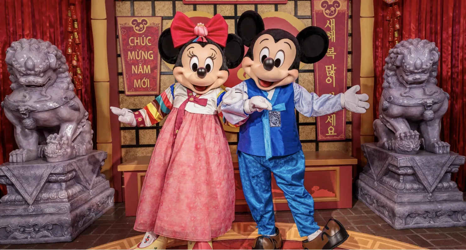 Ah, um fato super temático é ver os personagens todos caracterizados com roupas asiáticas pelo parque, principalmente o Mickey e a Minnie, que ficam disponíveis para fotos com os visitantes.