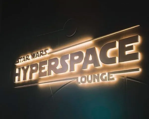 Um dos lounges mais imersivos já criados pela Disney Cruise Line. O Hyperspace Lounge simula um bar intergaláctico, com “janelas” que mostram diferentes pontos do universo Star Wars em tempo real.