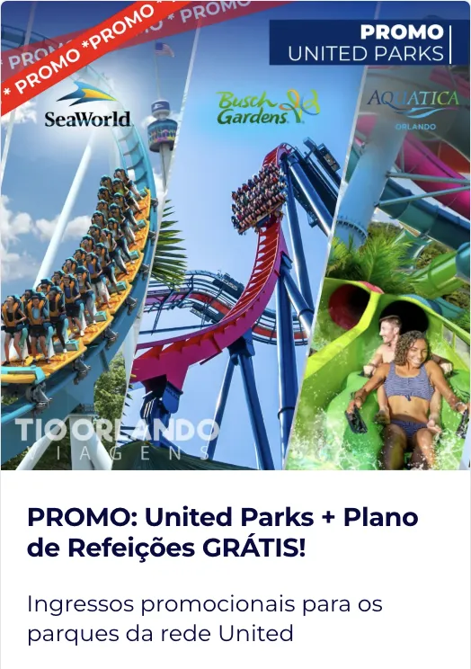 Na compra de 01 (um) ingresso, você ganha 3 dias de visita em 3 parques da United Parks com o All Day Dining incluso (plano de refeições).