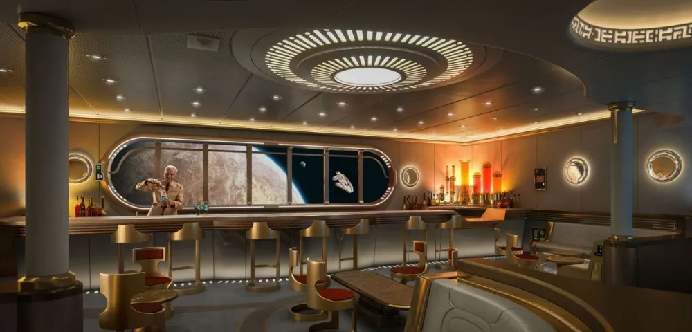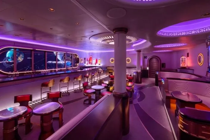 O Hyperspace Lounge no Disney Wish é um bar temático de Star Wars exclusivo para adultos, que simula uma viagem pelo espaço.