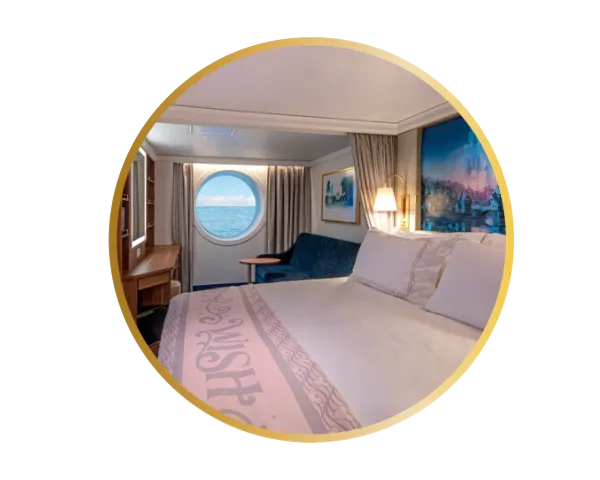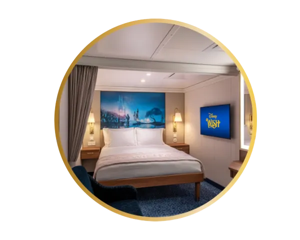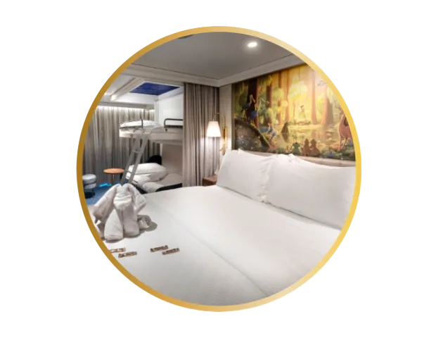 Com metragem mais generosa do que a oferecida por cabines equivalentes na maioria dos navios de cruzeiro, a acomodação Standard se destaca pelo conforto ampliado e pelos detalhes discretos que trazem a magia da narrativa Disney ao ambiente.