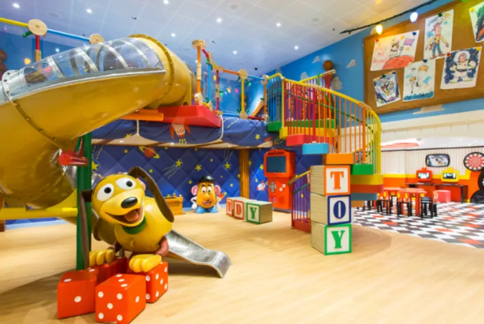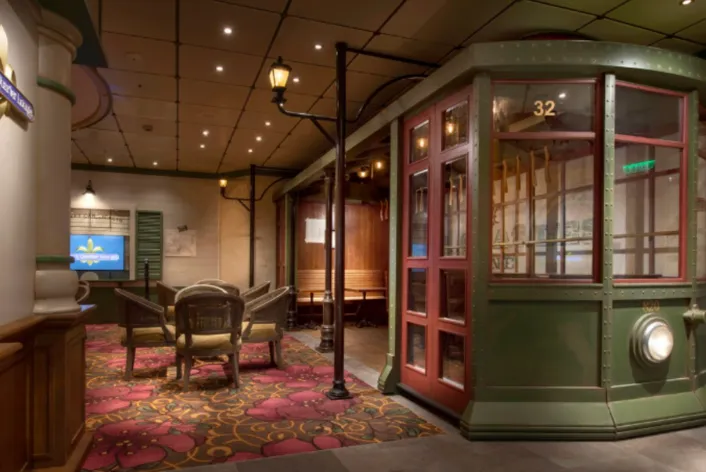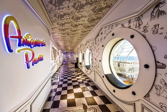 No saguão principal, a estátua de Ariel dá as boas-vindas aos hóspedes, reforçando o clima mágico do navio.